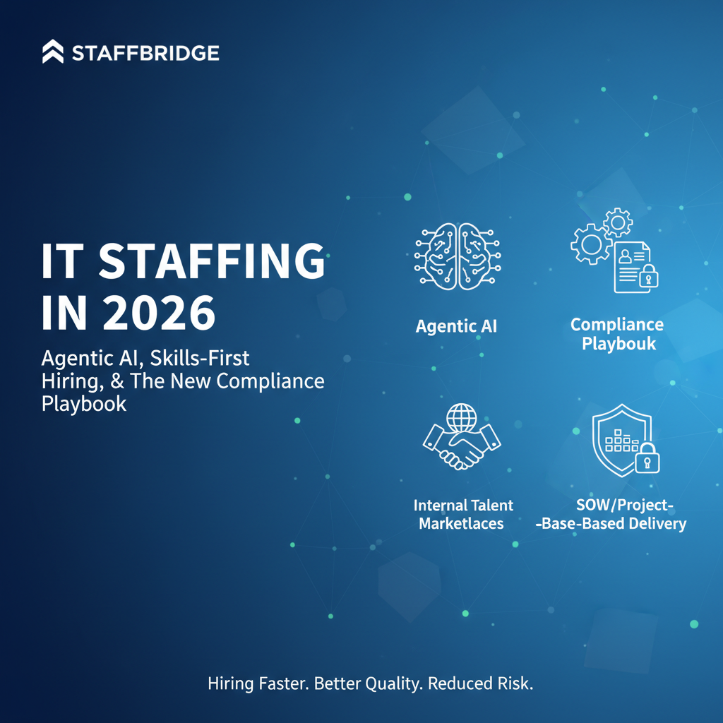 IT staffing in 2026 is being reshaped by agentic AI in recruiting, skills-based hiring, and higher expectations for compliance and transparency (AEDT audits and pay transparency). At the same time, internal talent marketplaces and SOW/project-based delivery are changing how companies buy talent. This article outlines the biggest shifts and a practical playbook for hiring faster while improving quality and reducing risk.